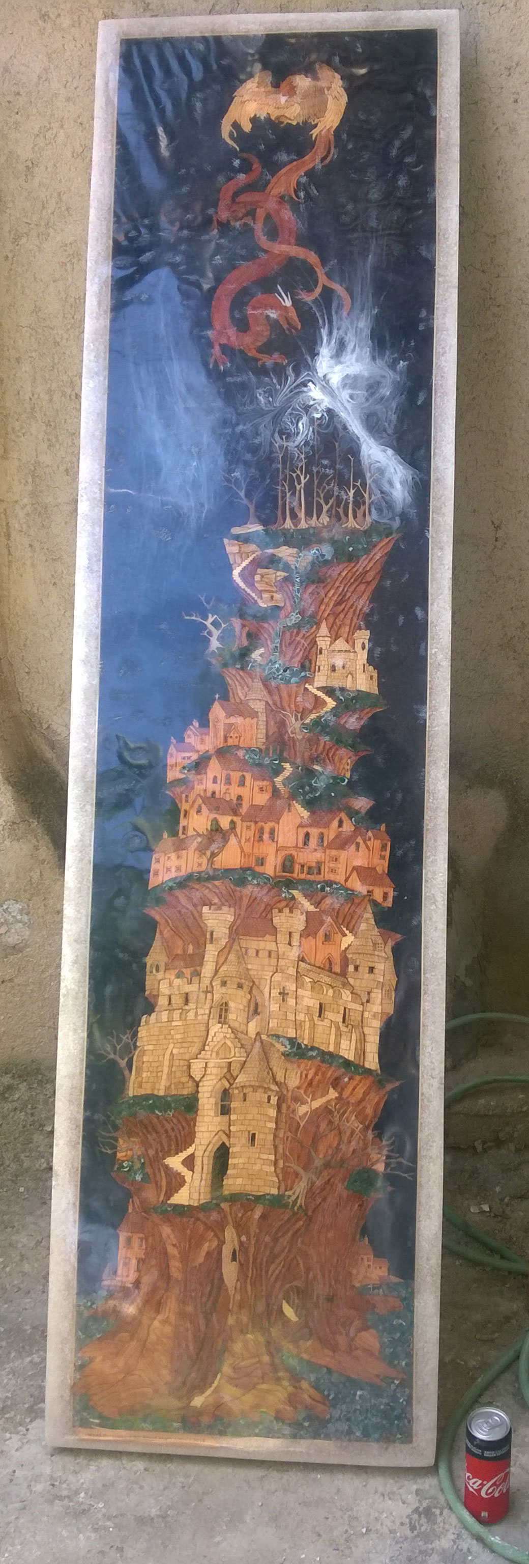 This is Roauf's biggest Wood Inlay/Wood Marquetry panel that its size is two meters. This is made of different kinds of wood and black, white, green and blue stones within five months.